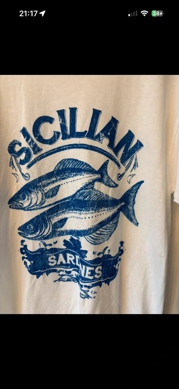 The River Island Sicilian Graphic T-shirt in White and Blue is available in sizes M.