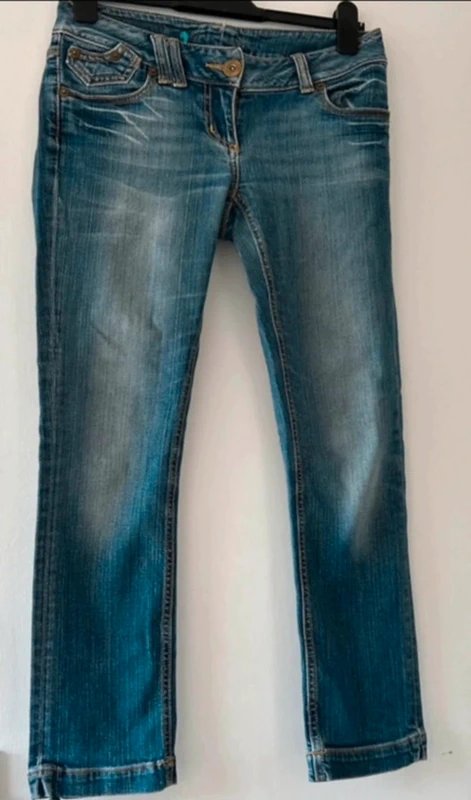 Step into serious Y2K vibes with these iconic mid-rise River Island jeans, featuring a faded blue wash, embroidered detail on both back pockets, and a leopard print inner waistband. Ideal for fans of early 2000s fashion and nostalgic denim styles.