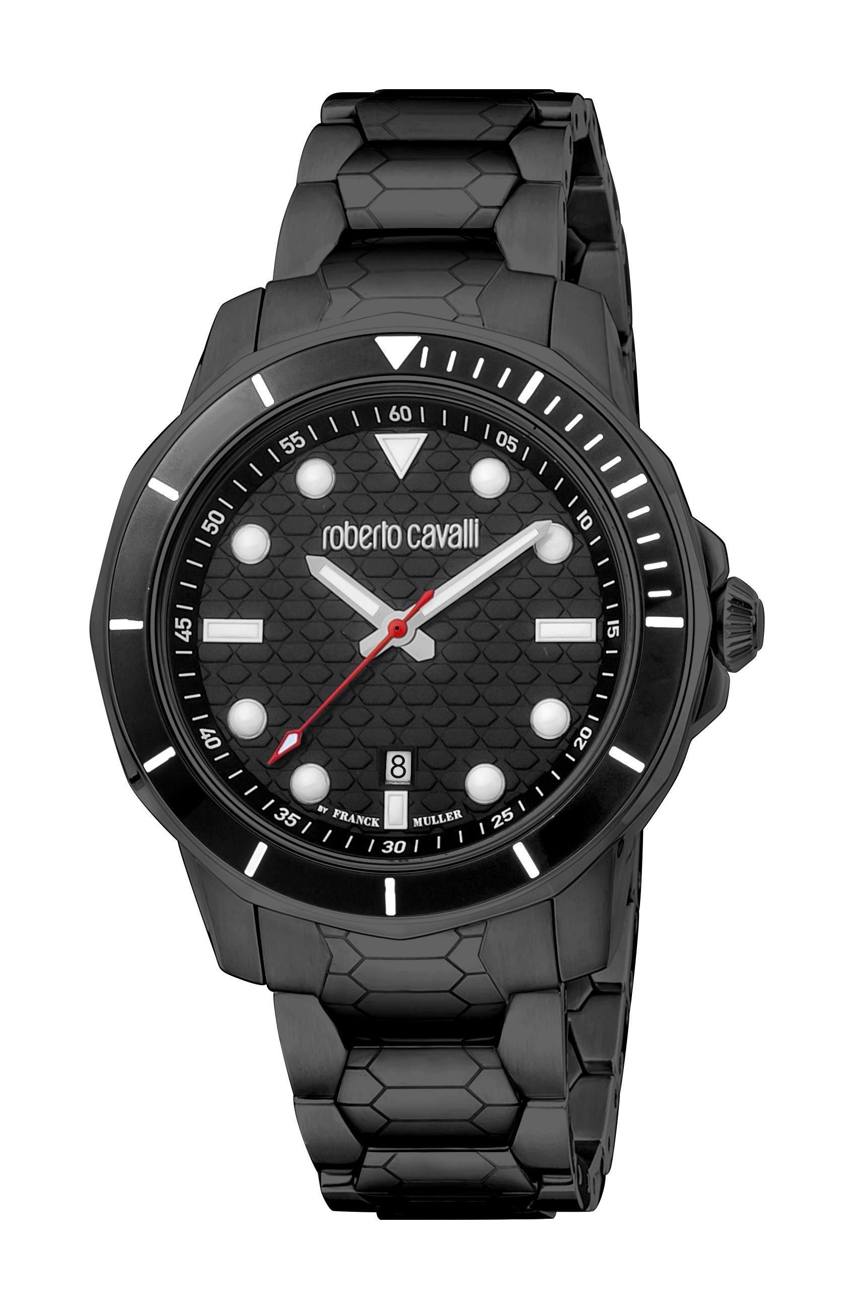 Stylish Roberto Cavalli by Franck Muller men's watch with a black dial and black stainless steel case and bracelet. Features a black stainless steel bezel, luminescent hands and markers, and a date display at the 6 o'clock position.