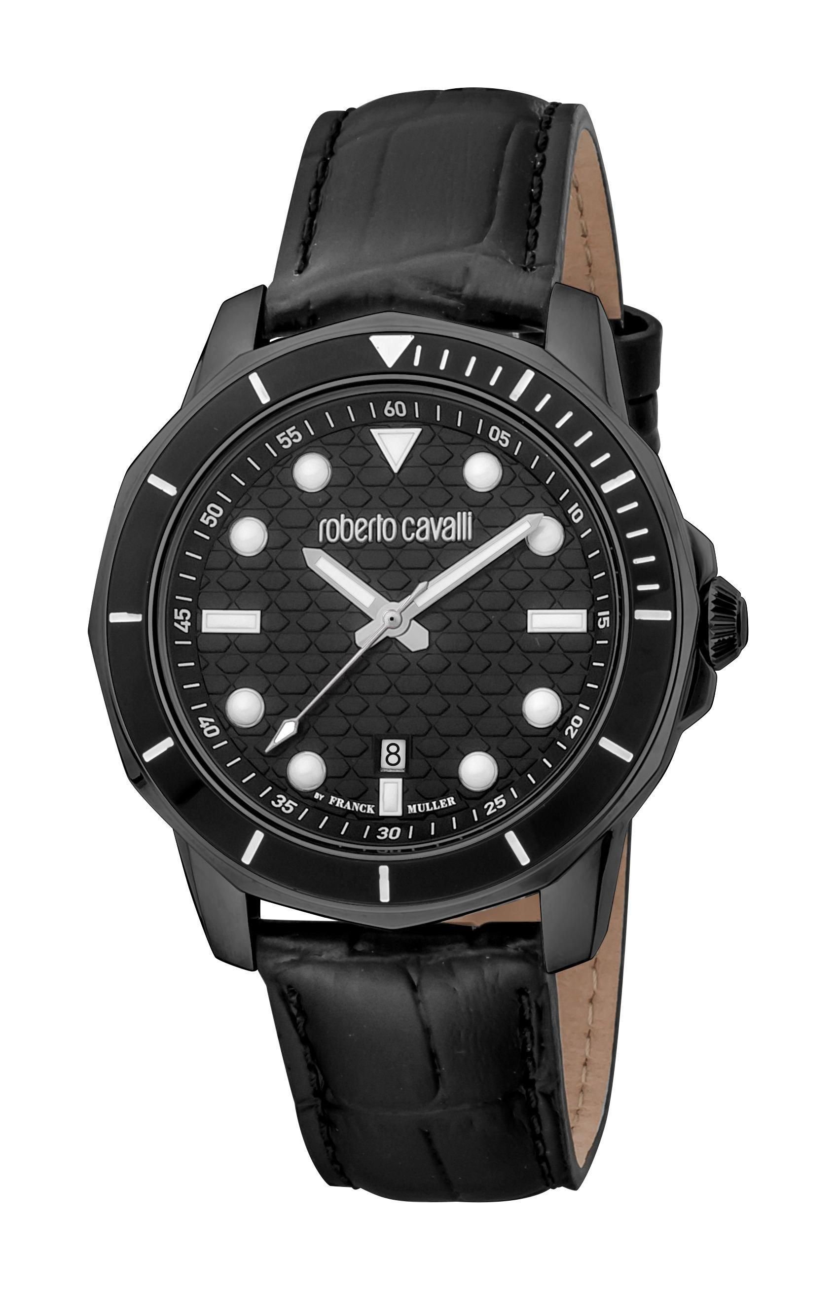 Stylish Roberto Cavalli by Franck Muller men's watch with a black dial and black leather strap. Features a black stainless steel case and silver-tone hands. Perfect for a sophisticated look.