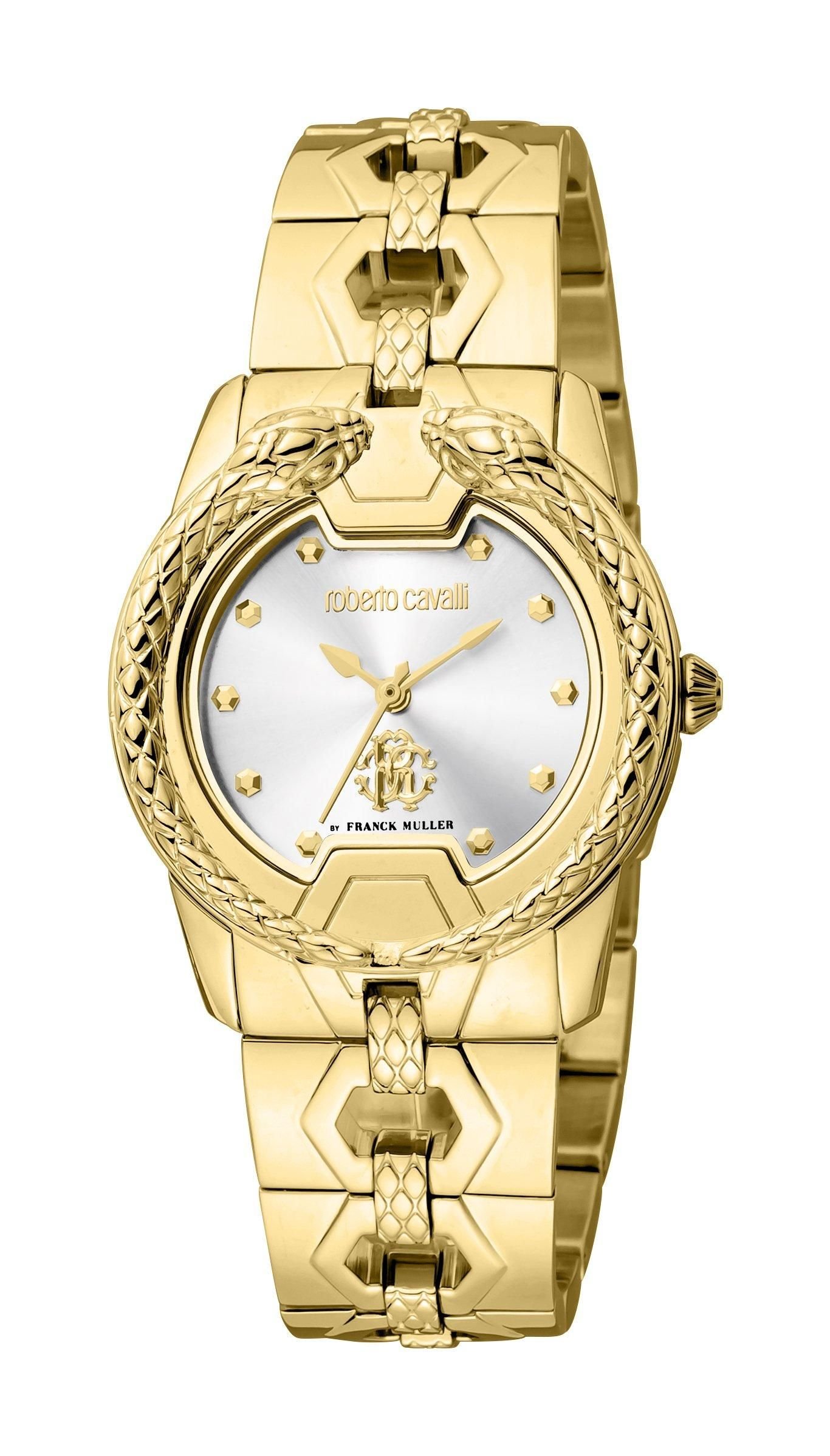 Luxurious Roberto Cavalli ladies watch with a yellow gold-tone stainless steel case and bracelet. Features a fixed yellow gold-tone stainless steel bezel and a silver-tone dial with yellow gold-tone hands and index hour markers. Analog dial with quartz movement.