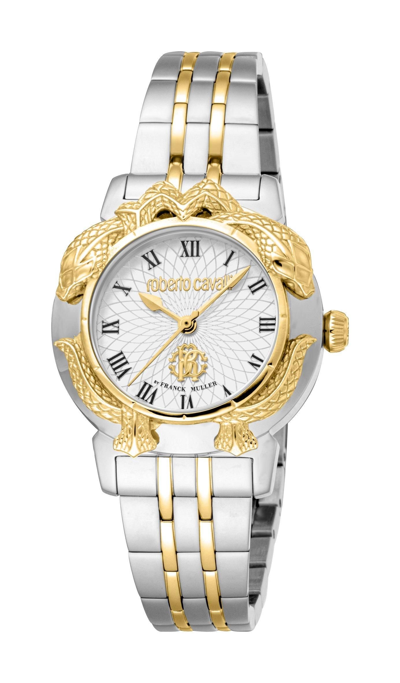 Luxurious Roberto Cavalli by Franck Muller watch featuring a silver-tone stainless steel case and a two-tone stainless steel bracelet. The fixed yellow gold-tone bezel complements the silver-tone dial with yellow gold-tone hands and Roman numeral hour markers.