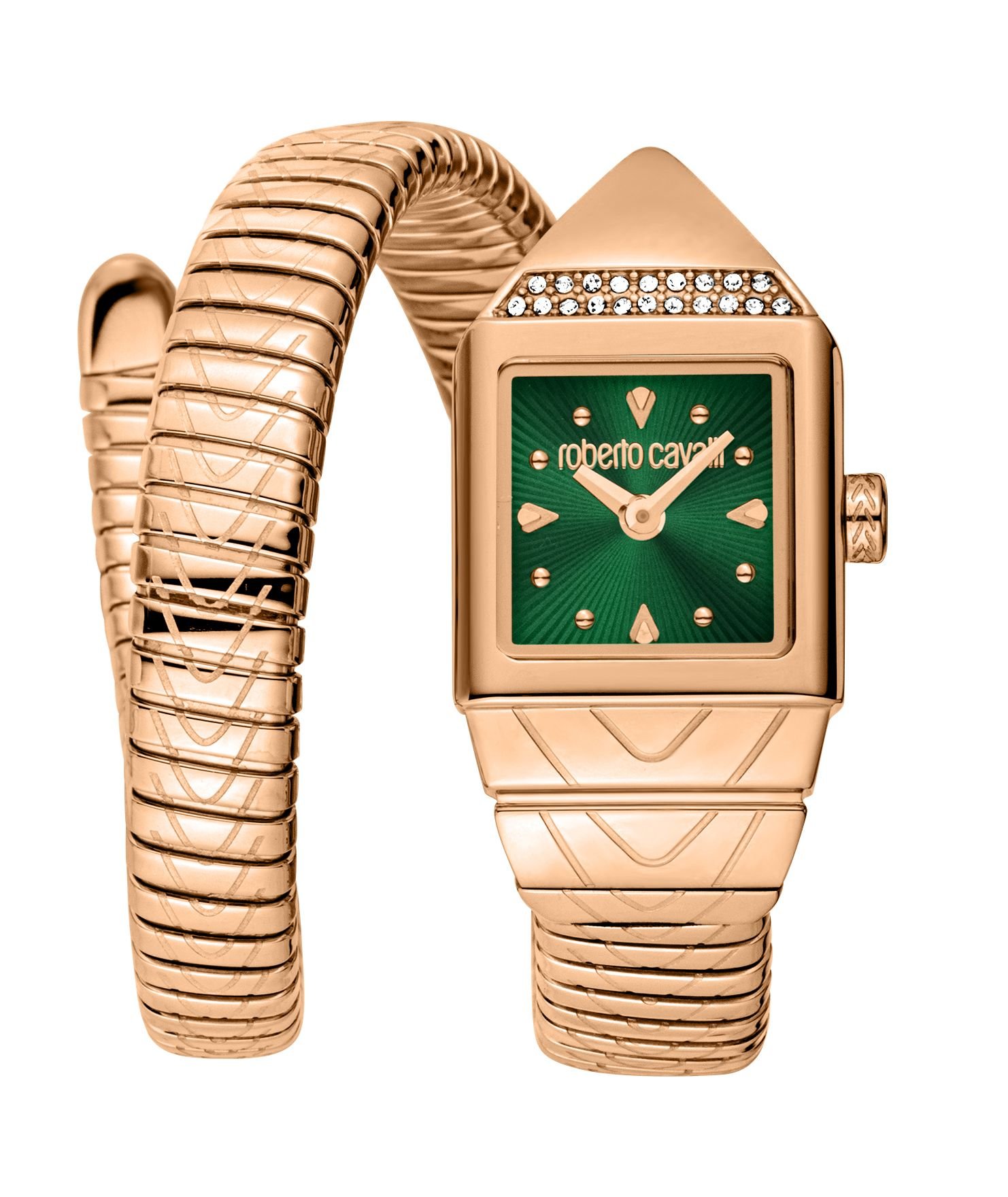 Luxurious Roberto Cavalli watch featuring a snake-like design with a two-tone silver and gold finish. The emerald green dial is adorned with diamond accents, adding a touch of elegance.