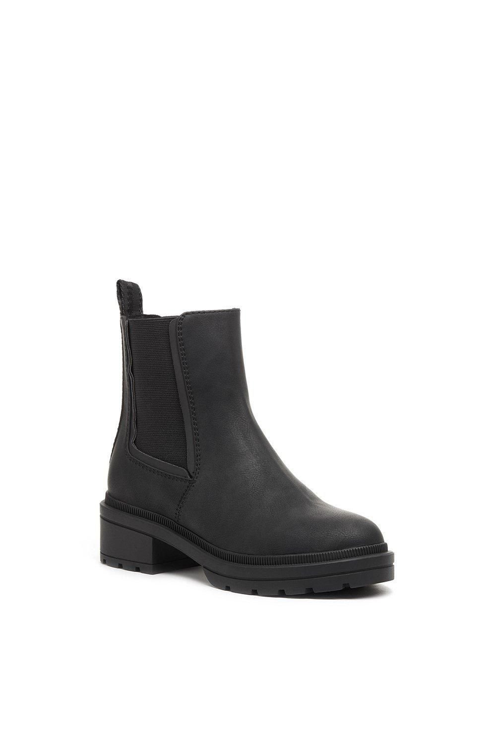 Versatile black mid boots with a chunky heel and flexible lug sole. Designed for comfort with a plush foam insole, perfect for autumn.