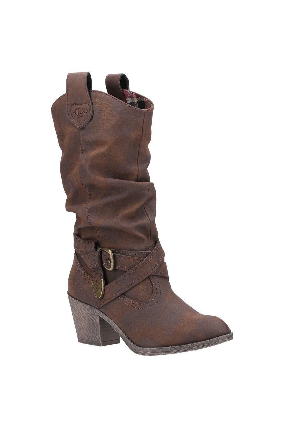 Stylish western-style pull-on long boots in brown PU with a mid-height heel and ankle strap detail. Perfect for adding a touch of edge to any outfit.