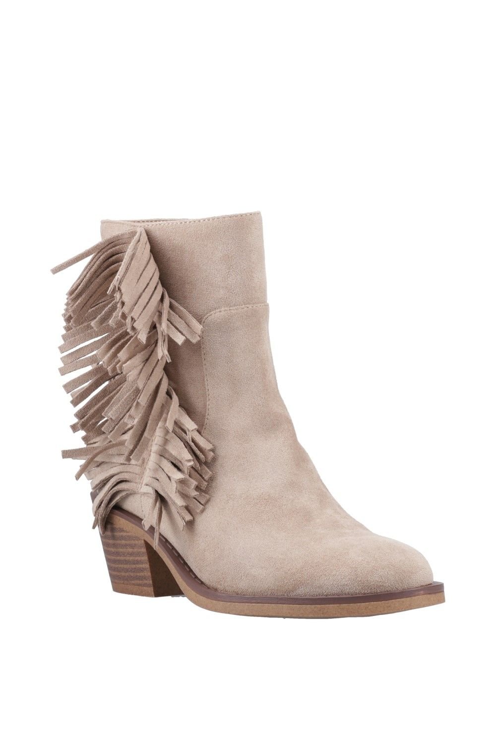 Trendy western-style boots in taupe suede with fringe details. Designed for all-day comfort and standout appeal.