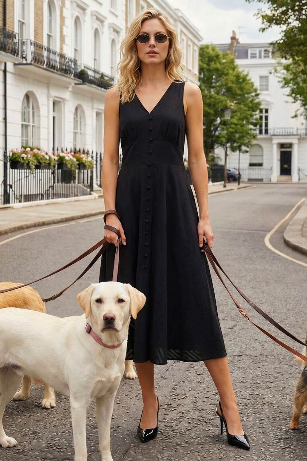 The Roman Black Cotton Sleeveless Midi Dress is ideal for casual, summer, daytime.