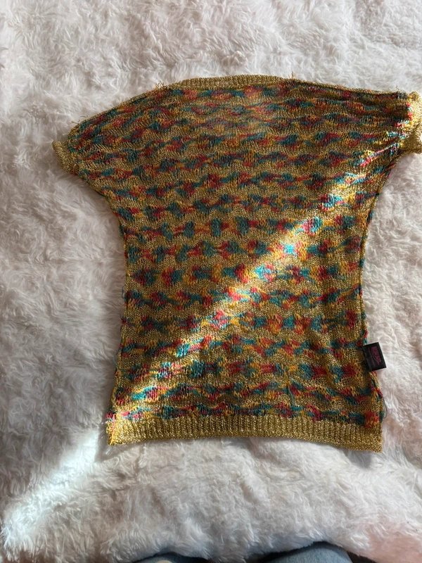 Vintage metallic knit top from Romantic Harbor. Defined by an intricate, multi-coloured chevron pattern, this piece features a vibrant palette of teal, scarlet, and ochre woven into a shimmering gold metallic base. The design is crafted with a lightweight, semi sheer open knit that offers a unique texture and a flattering fit. Perfect for adding a touch of sparkle to your wardrobe.