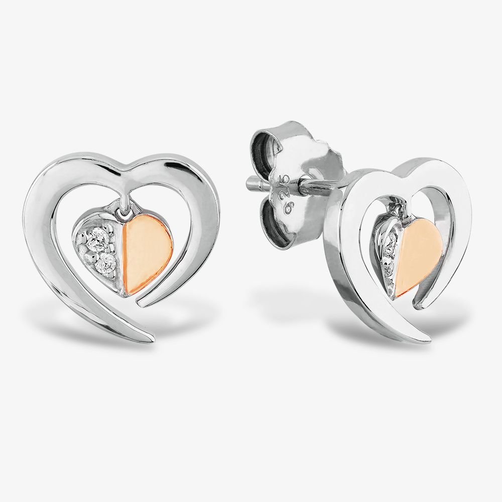 Contemporary floating heart stud earrings by Rosa Lea. Featuring a textured folded heart design with one half pav and one half polished precious metal, these earrings hang from an open abstract frame. The sterling silver and rose studs are perfectly balanced and lightweight.