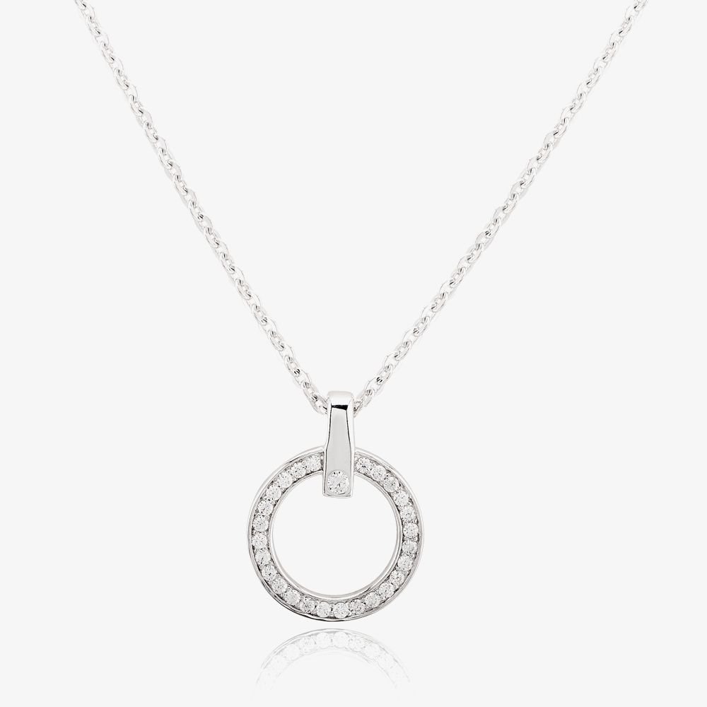 Elegant silver open circle pendant necklace with cubic zirconia pave stones. Sterling silver chain for a luxurious look. Perfect for everyday wear.