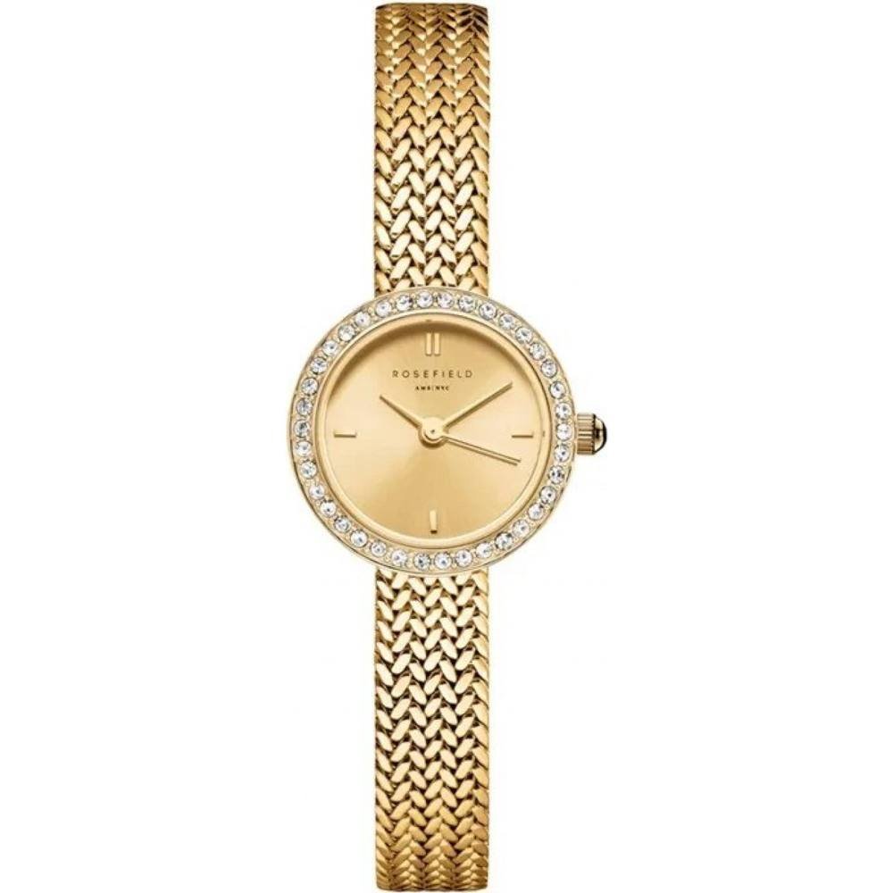 This gold quartz watch from Rosefield features a round dial adorned with crystals and a woven gold bracelet. Ideal for everyday elegance and special occasions.