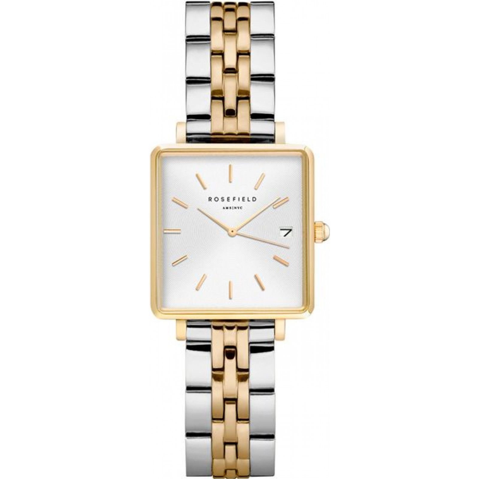 Stylish multicolor boxy watch from Rosefield. Features a square dial and a two-tone bracelet with a mix of gold and silver tones. Ideal for everyday wear and special occasions.
