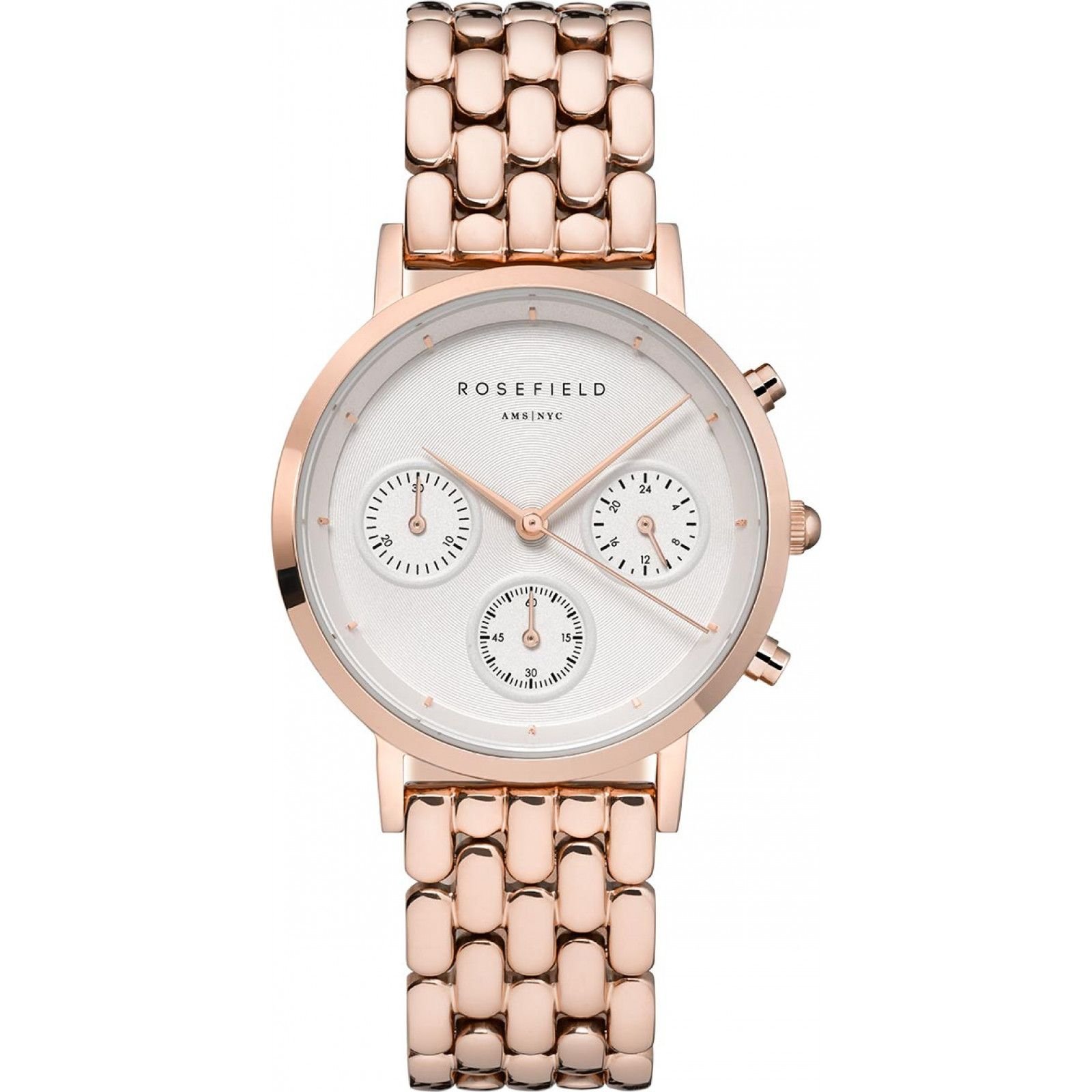 Elegant Rosefield NWG-N91 quartz watch in rose gold. Features a white dial with three sub-dials and a textured bracelet. Ideal for everyday wear and special occasions.