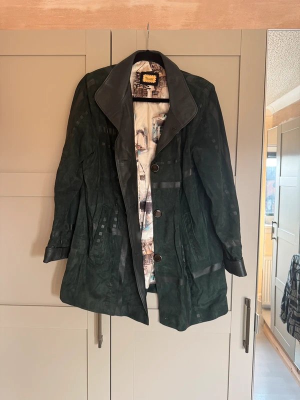 Designed in dark green, this long-sleeve coat features a button closure and leather material. Perfect for a casual or evening look.