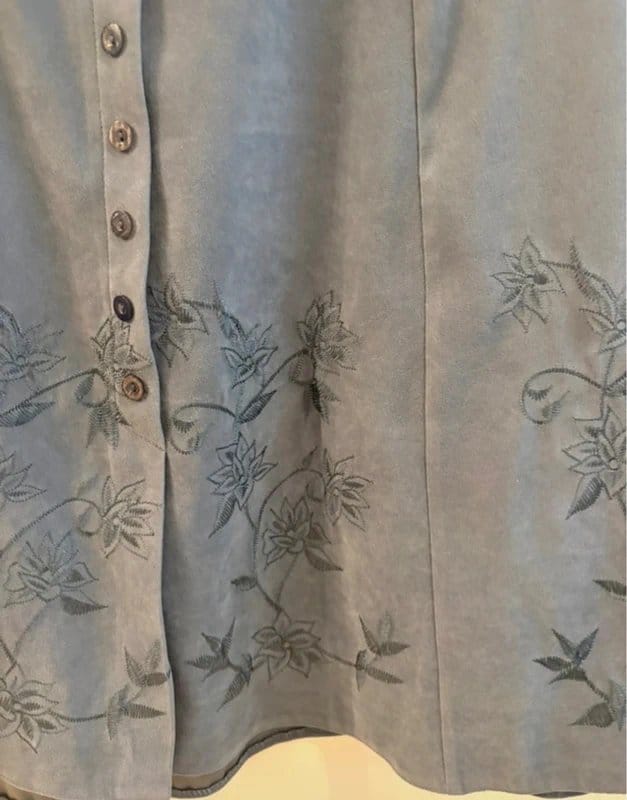 Charming light blue vintage skirt with an embroidered floral pattern. Features a full skirt with a button-front closure and a high waist. Ideal for a bohemian look.