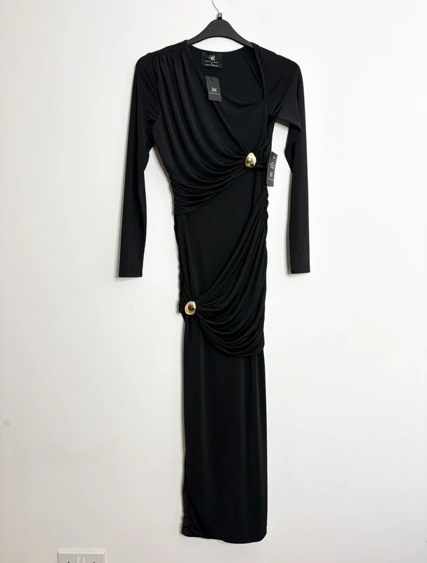 The Ruched & Ready Black Asymmetric Maxi Dress is available in sizes S.