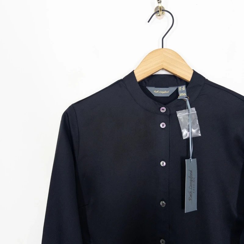 The Ruth Langsford Elegant Grandad Collar Satin Blouse is available in sizes S.