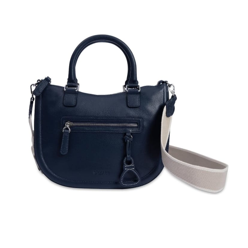 Elegant SADDLER handbag in navy leather with versatile functionality. Features twin handles and a comfortable cotton webbing crossbody strap. Sleek design with practical features for a stylish accessory.