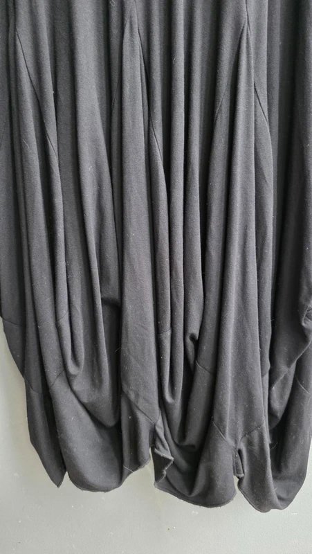 Stunning Sahara black midi dress with a dramatic ruched/gathered hem and elegant 3/4 sleeves. Great Pre-owned condition overall with some minor flaws, please see photos for small tears.