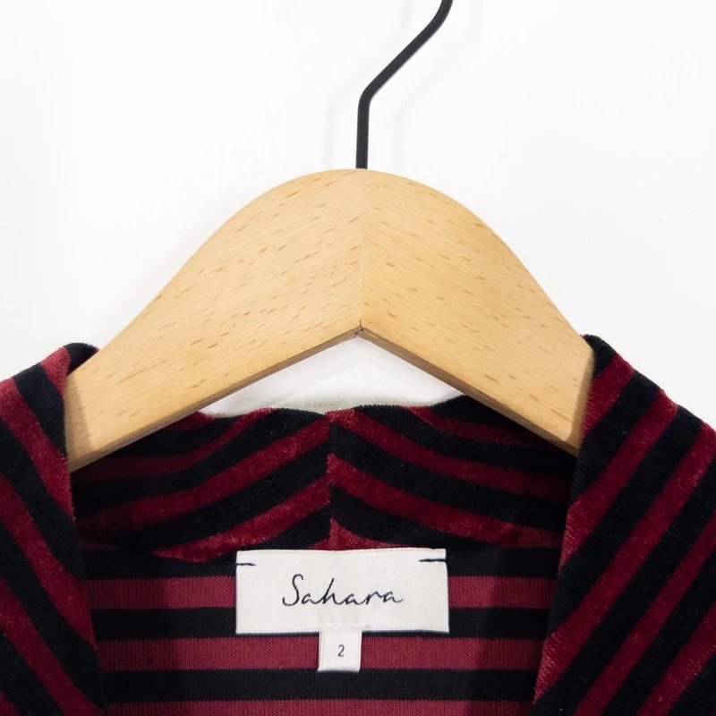 The Sahara Velvet Stripe Midi Dress with V Neck is available in sizes M.
