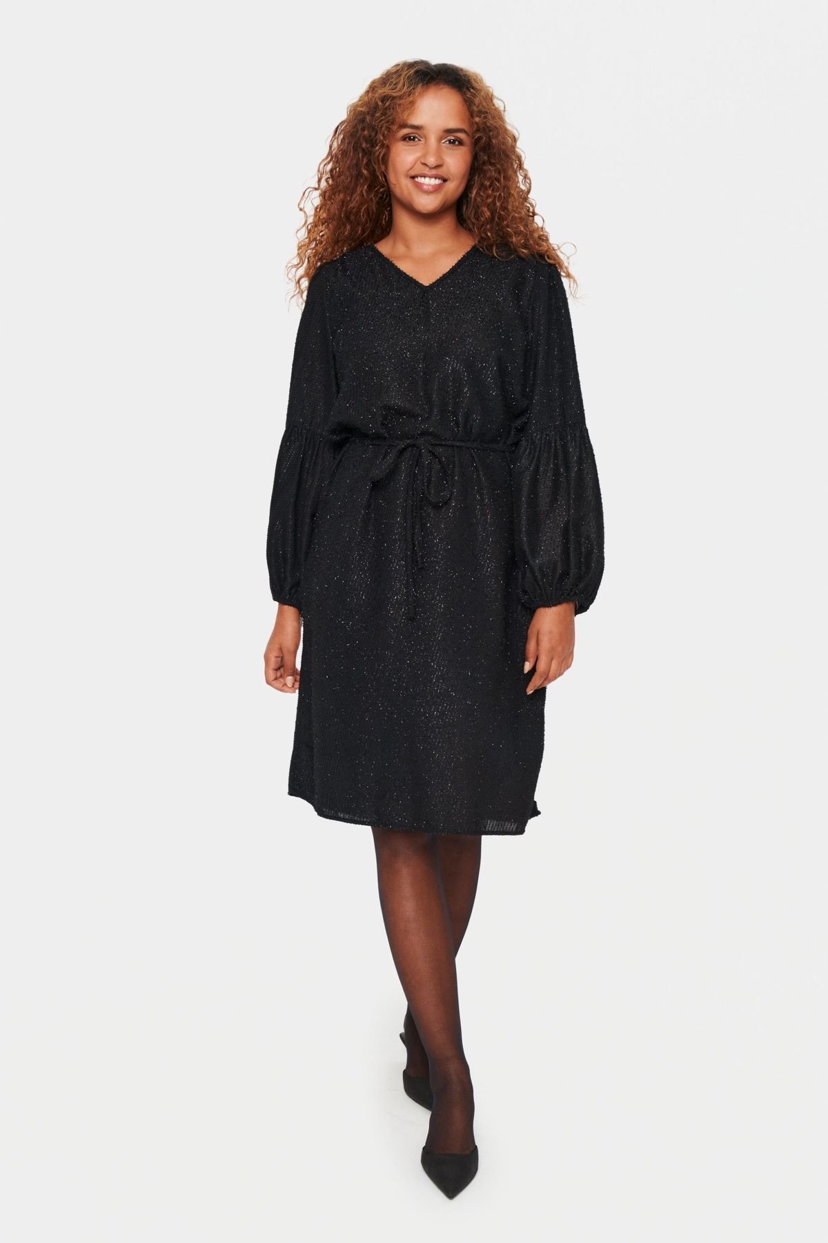 This Saint Tropez dress features a V-neckline and long bishop sleeves with a pleated seam. The glitter fabric adds a touch of elegance, perfect for a casual cocktail event.