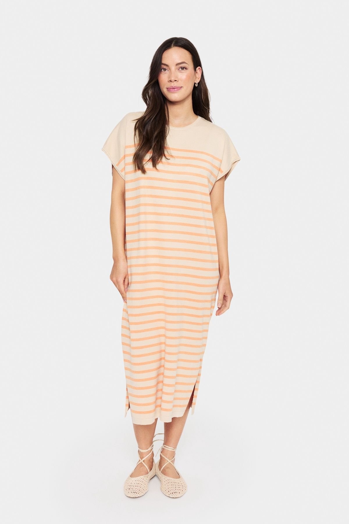 Experience effortless elegance with the Saint Tropez MilaSZ Striped Midi Dress in ecru. Crafted in a loose fit for ultimate comfort, this dress features a serene Fog Orange Stripe pattern. Perfect for casual outings or relaxed evening wear.