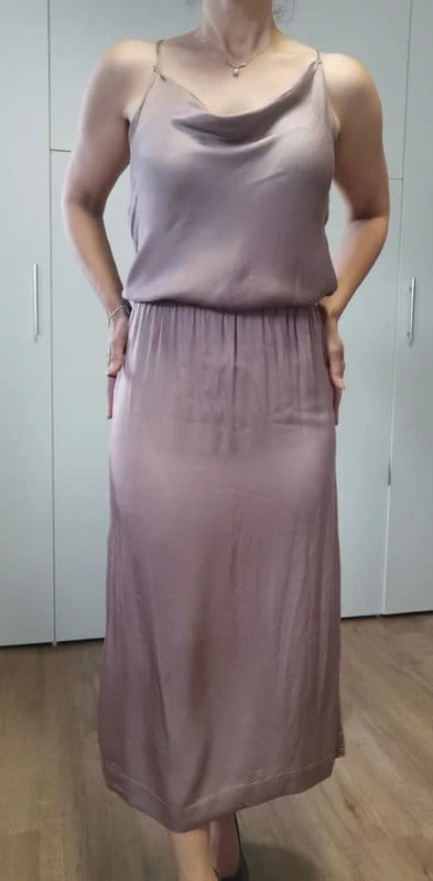 Elegant slip-style maxi dress from Saint Tropez in a soft blush pink shade. Features a flattering cowl neckline, adjustable spaghetti straps, and a light satin finish that drapes beautifully over the body. The elasticated waist adds comfort and shape without compromising on the sleek silhouette.
