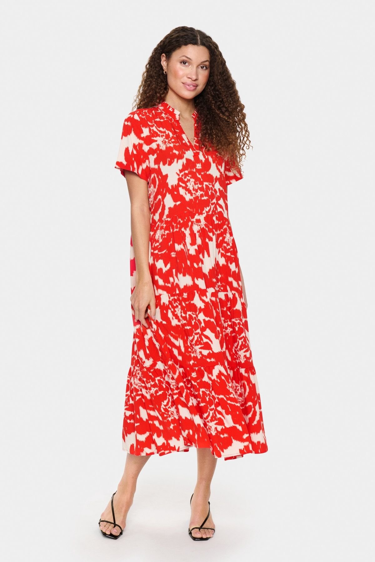 Versatile maxi dress in scarlet floral print with a frilly mandarin collar and V-notch neckline. Features a relaxed fit and tiered layers in the skirt for movement. Ideal for both work and leisure.