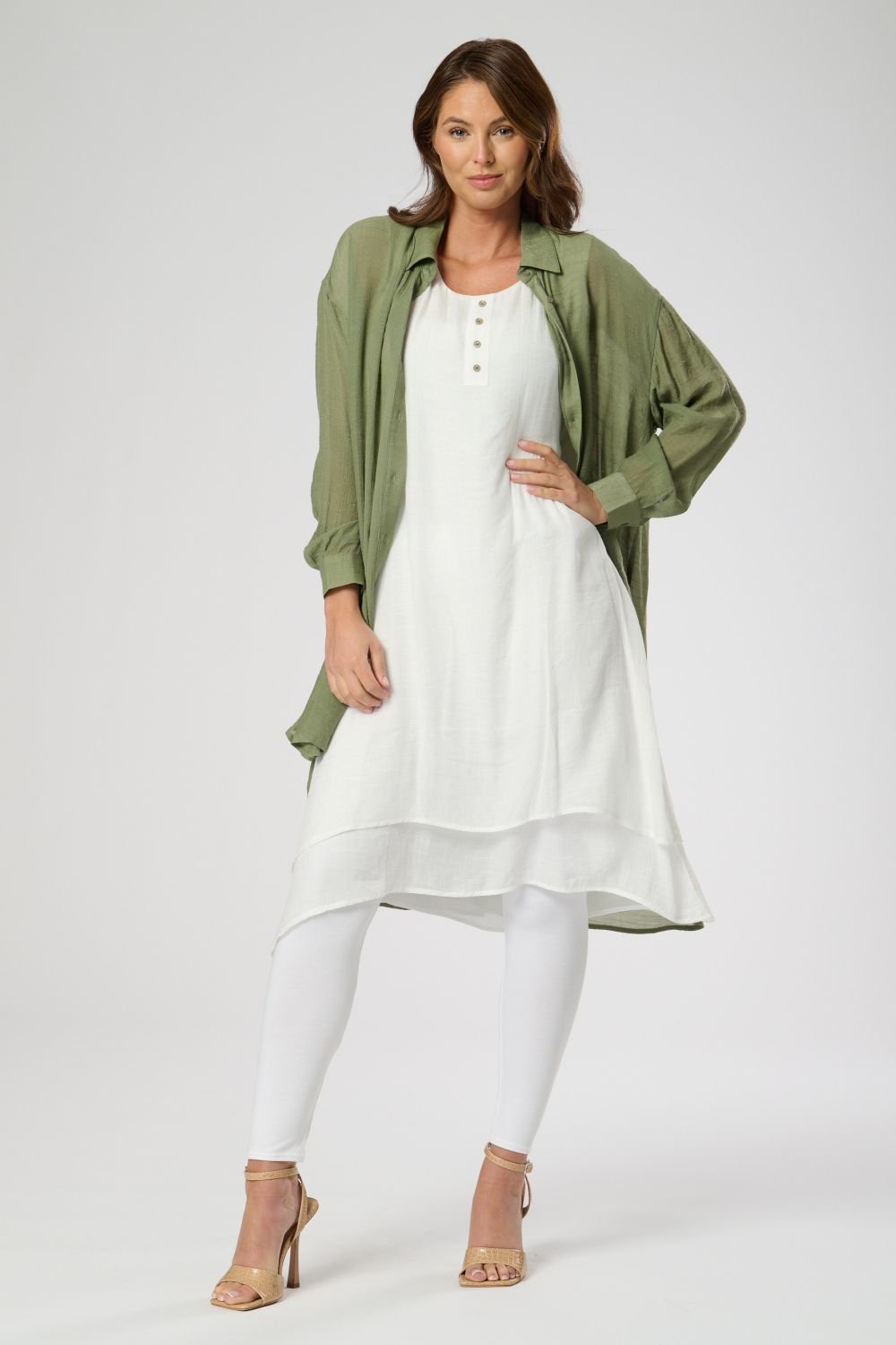 The Saloos Khaki Layered Dress with Dip Back Shirt is available in sizes 14, 16.