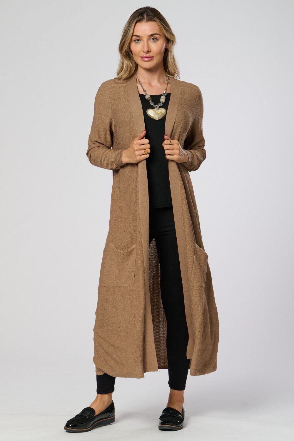 Chic longline cardigan in taupe featuring an open front and ribbed cuffs. Designed for a relaxed fit with roomy front pockets, it's perfect for layering over casual outfits.