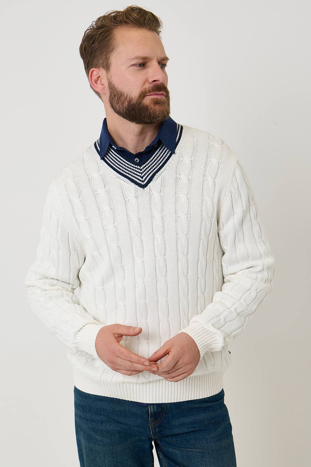 The Saltwell Men's Cable Knit Cotton Cricket Jumper in Ecru is ideal for casual, smart-casual, outdoor.