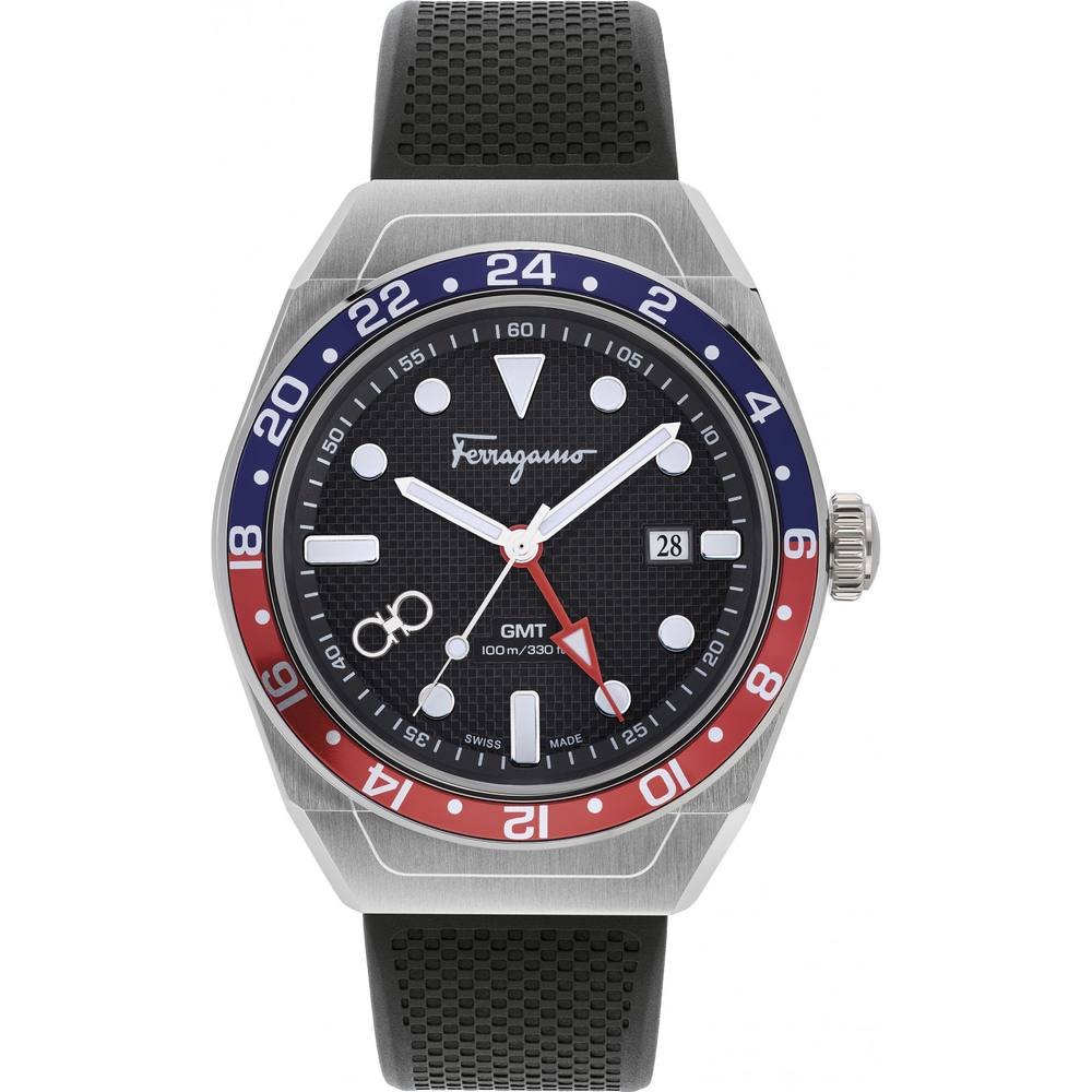 Stylish Salvatore Ferragamo men's watch with a black dial, red and blue accents, and a black rubber strap. Crafted with precision, it features a GMT function and Swiss-made quality.