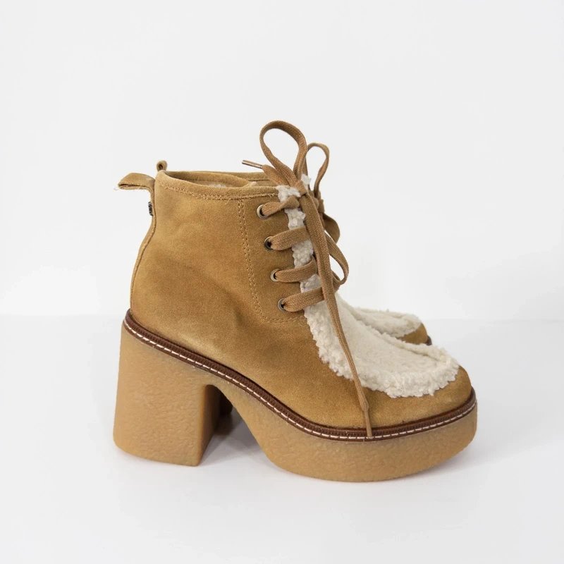 Brown Suede Leather Lace Up Boots with Beige Sherpa Fleece Lining — perfect for chilly weather. Featuring a chunky sole and platform heel, these boots offer both style and comfort. The suede leather upper is complemented by a cozy Sherpa fleece lining, making them ideal for colder days. With a lace-up closure, they provide a secure fit. Ideal for casual outings and everyday wear.
