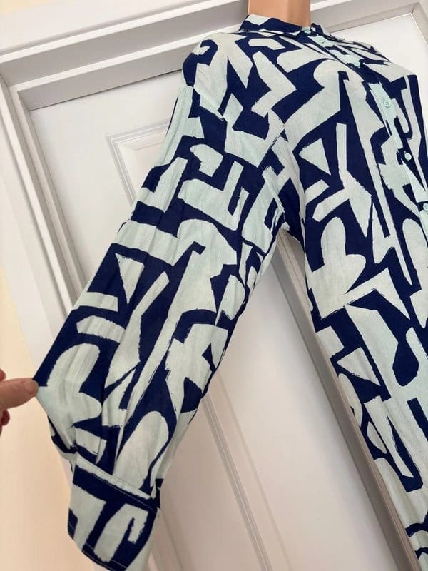 This maxi dress by Sandwich features a belted waist and a vibrant abstract print in shades of blue and white. Made from viscose, it offers a lightweight and flowing silhouette. Ideal for casual outings or summer events.