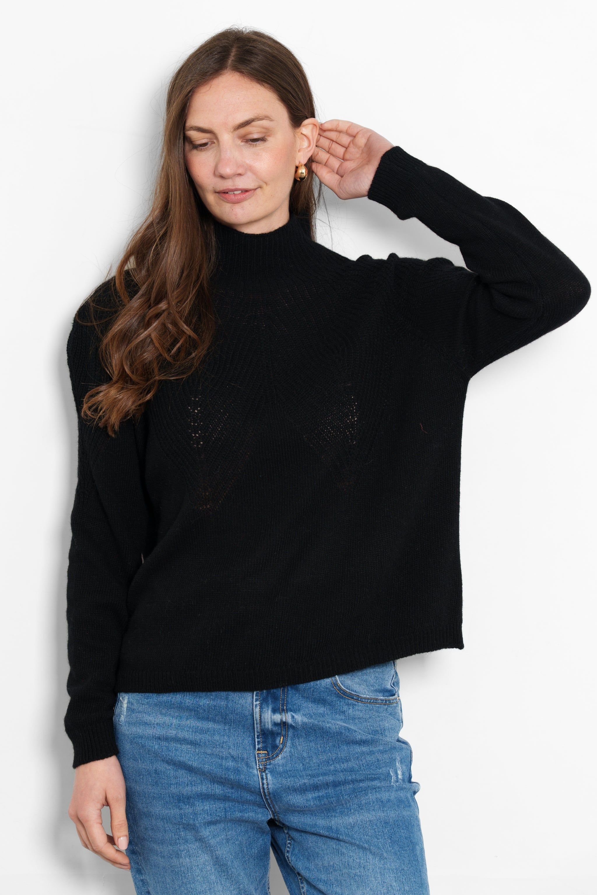 Luxurious black cashmere blend jumper with a ribbed pattern on the upper bodice. Designed for premium comfort and warmth, this classic piece is a wardrobe essential.