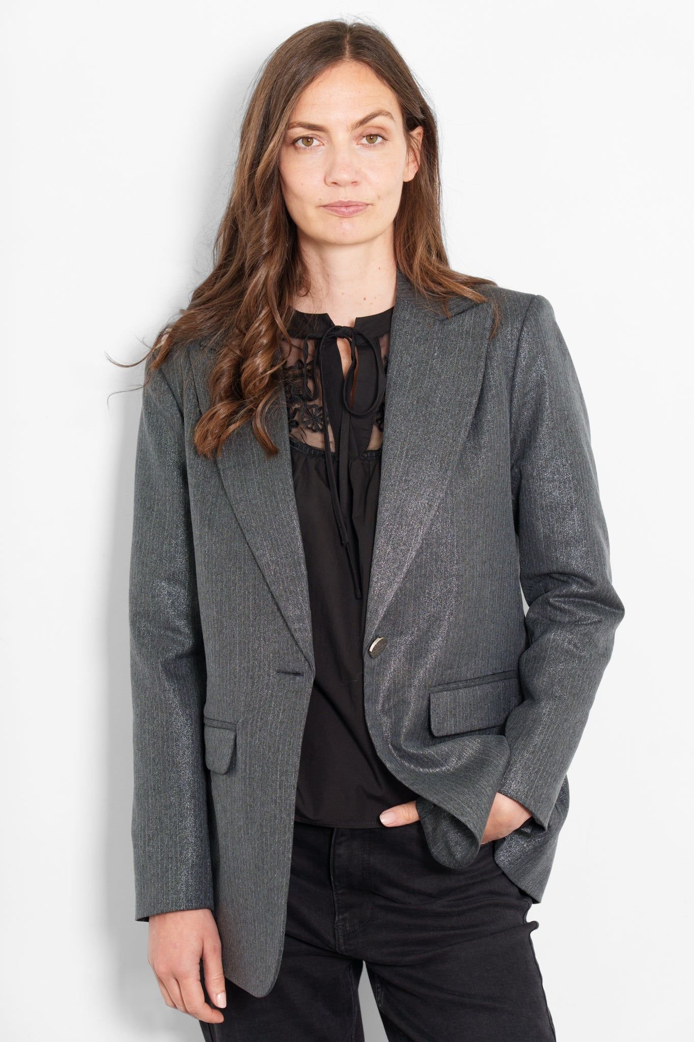 Stylish boyfriend blazer in mid grey with a subtle glitter stripe pattern. Designed for comfort with a shawl collar, long sleeves, and a classic notch lapel. Perfect for both day and night wear.