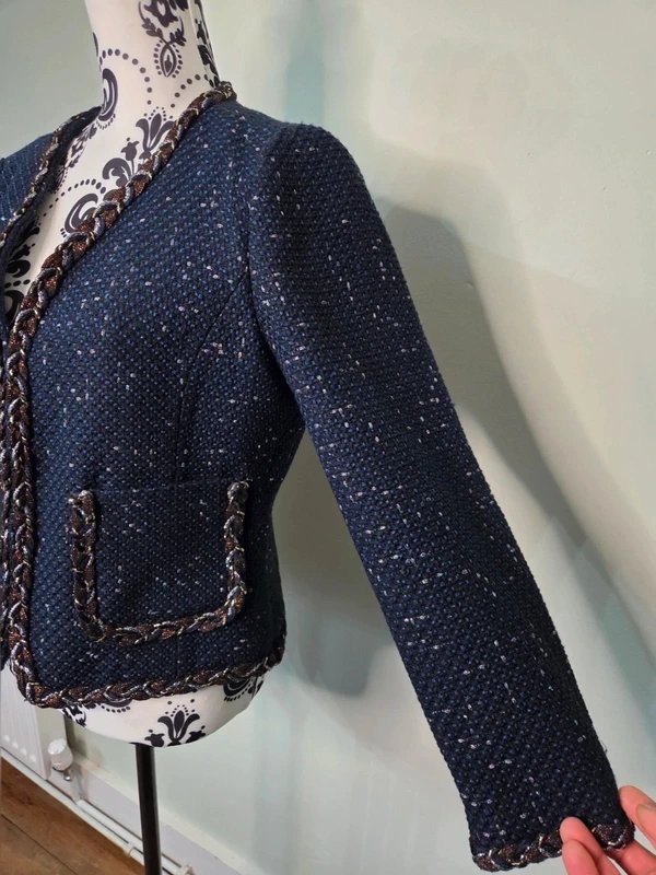 Beautiful Savida textured navy boucle/tweed-style jacket blazer with braided metallic trim around the neckline, front, pockets, and hem. Perfect over dresses, jeans, or work outfits.