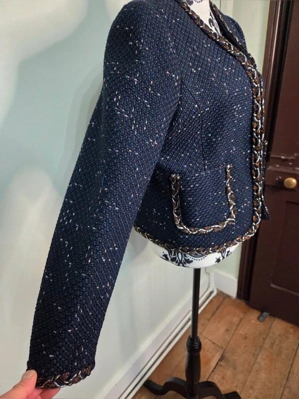 Stylish Savida navy boucle jacket blazer with braided metallic trim around the neckline, front, pockets, and hem. Perfect for layering over dresses, jeans, or work outfits.