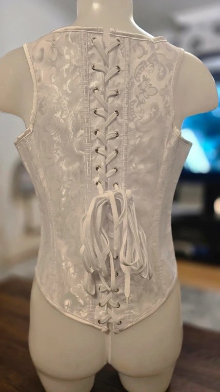 Crafted with a white brocade fabric, this steel boned steampunk Tesla underbust corset provides a unique neck waist tank top corset. It is perfect for adding a touch of vintage flair to any outfit.