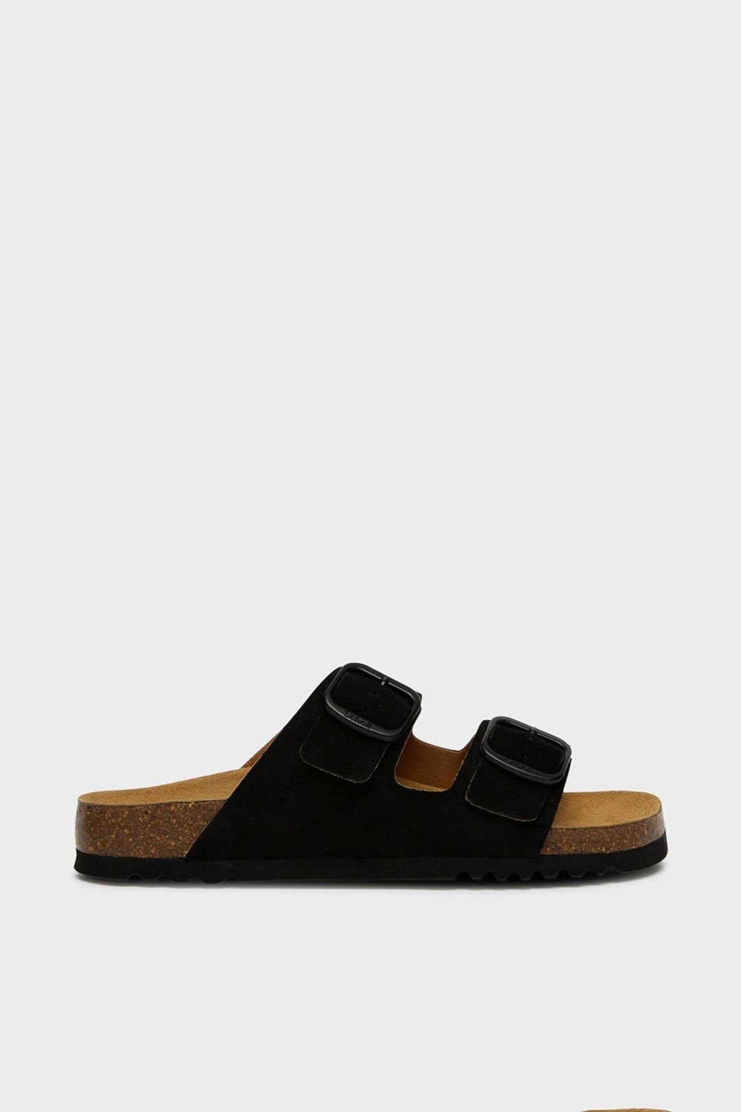 Classic two-strap design with adjustable buckle fastenings for a customised fit. Contoured footbed providing exceptional comfort for all-day wear. Soft suede upper offering a luxurious texture and durability. Cork-look midsole adding a natural aesthetic to these casual sandals. Practical slip-on style.