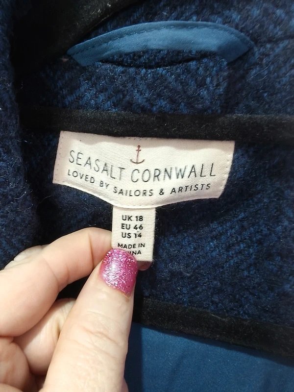 The Seasalt Cornwall Classic Blue Herringbone Coat is available in sizes L.