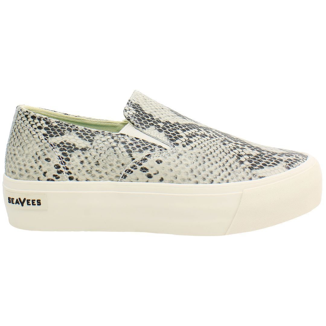Stylish Beige Snake Leather Slip-On Plimsolls by Seavees. Featuring a snake print upper, platform sole, and slip-on design. Ideal for casual outings.