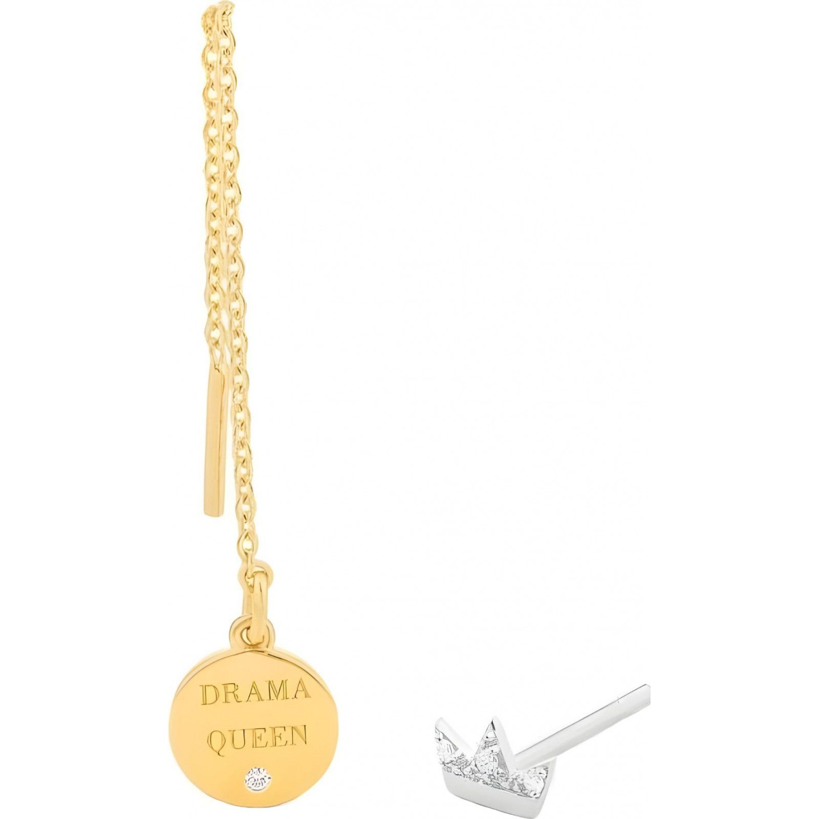Elegant gold-plated earrings from Secrecy featuring a round pendant with the inscription 'Drama Queen' and a small diamond accent. Perfect for adding a touch of glamour to any outfit.