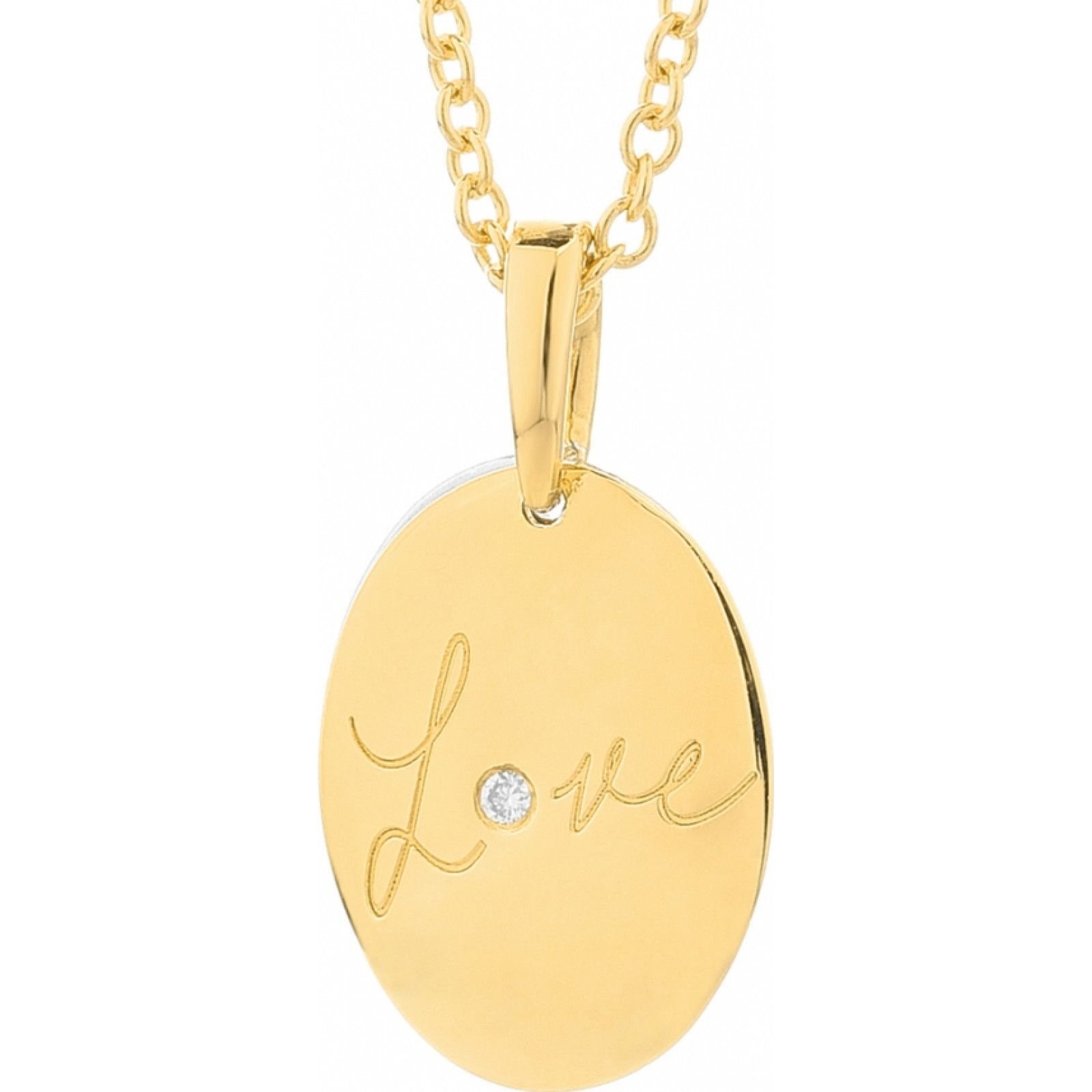 This gold necklace from Secrecy features a polished oval pendant with the word 'Love' engraved and a small diamond accent. A perfect accessory for any occasion.