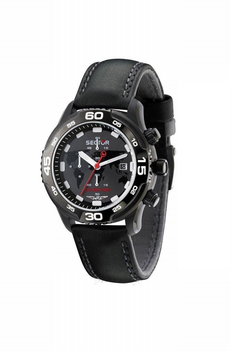 Stylish Sector Mountain Adventure watch in black with a black leather strap and black dial. Designed for adventure, it features a world map and adventure-themed graphics.