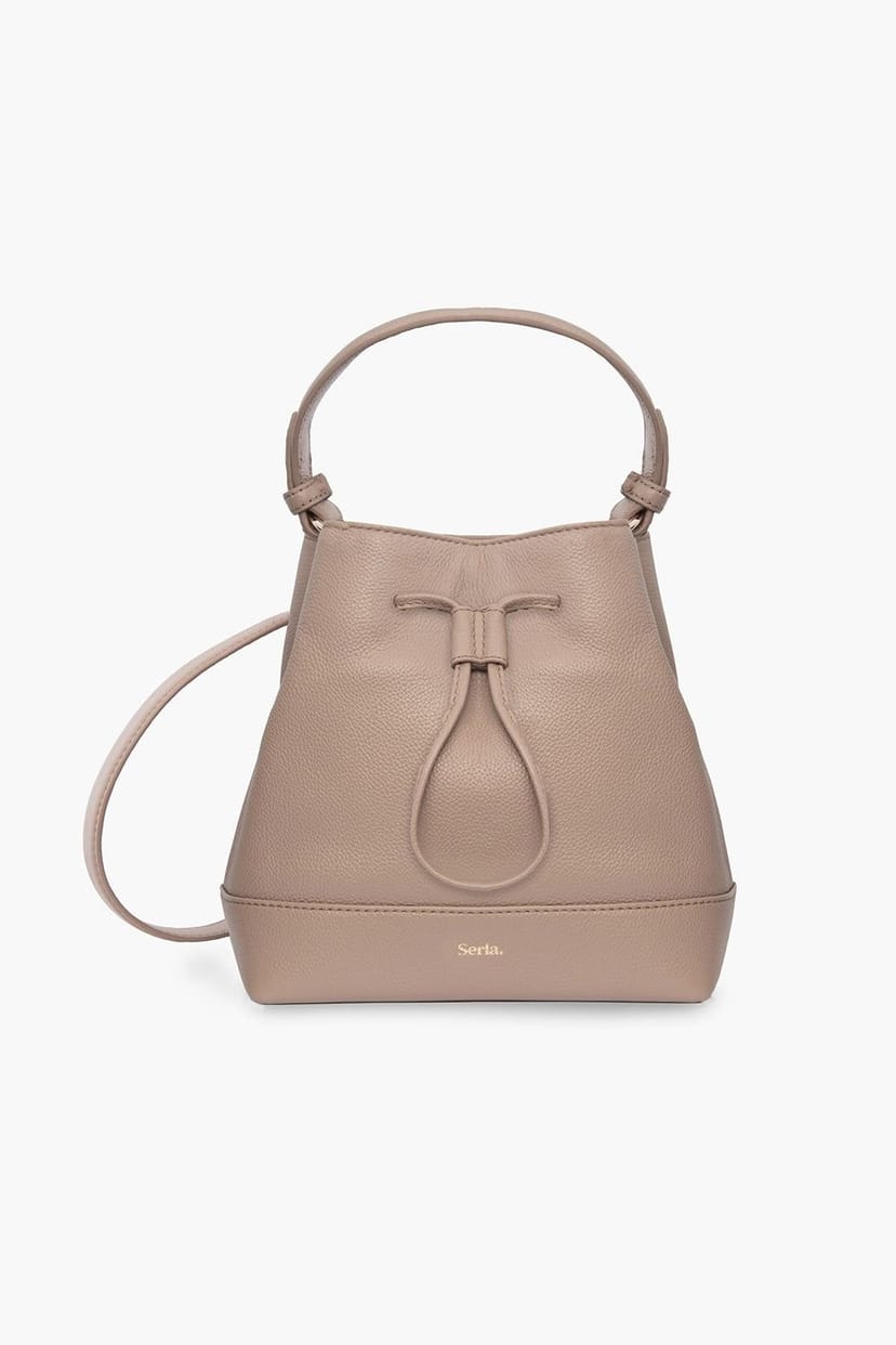 Stylish taupe real leather crossbody bag with a drawstring closure and inner zip pocket. Perfect for everyday use, featuring a pebble finish for a soft look.