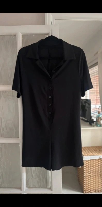A black ribbed playsuit featuring a polo collar and button closures, ideal for casual wear.