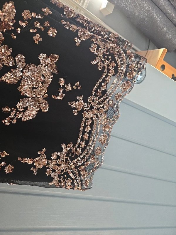 This stunning black mesh dress is beautifully embellished with rose-gold sequins in a floral design. Featuring a flattering wrap-style V-neckline and long sheer sleeves decorated with matching sequins for a glam, elegant finish. Fully lined body for comfort, with a sheer sequin hem for added detail.