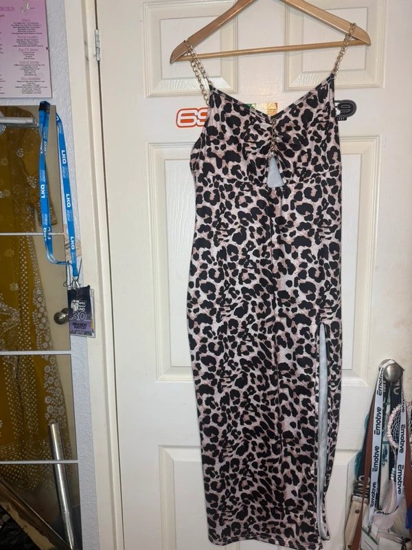 The Shein Leopard Print Midi Dress with Chain Straps is available in sizes L.