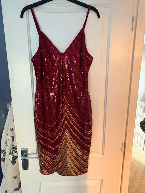 The Shein Red & Gold Sequin Cami Party Dress is available in sizes L.